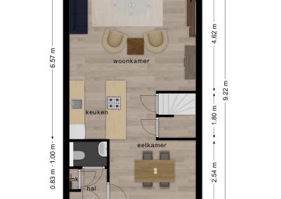 De begane grond heeft meerdere mogelijkheden voor het plaatsen van de keukenopstelling. Hierdoor kan er meer ruimte voor de zithoek gerealiseerd worden of juist een grotere woonkeuken. De dubbele openslaande tuindeuren geven toegang tot de achtertuin.